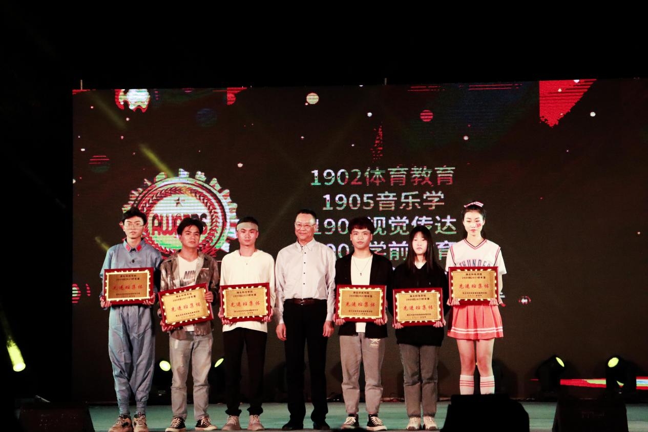 在节目精彩进行中,钟副校长和各部门领导为先进集体、优秀团支部、优秀班干部、优秀文体学生、奖学金获得者分别颁奖并合影留念。